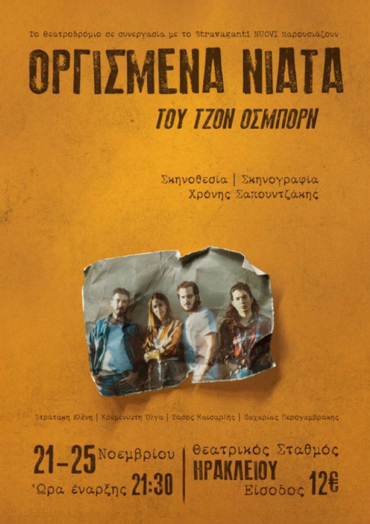 Το Θεατροδρόμιο σε συνεργασία με τους StravagantiNuovi και την Περιφέρεια Κρήτης παρουσιάζουν το Θεατρικό έργο του John Osborn “Οργισμένα νιάτα”, σε μία δωρεάν για το κοινό παράσταση, το Σάββατο 9 Μαρτίου, στον Θέατρικό Σταθμό Ηρακλείου.