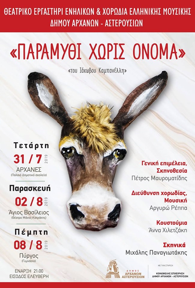 Το Θεατρικό Εργαστήρι του δήμου Αρχανών-Αστερουσίων ανεβάζει φέτος το μοναδικό θεατρικό έργο του Ιάκωβου Καμπανέλλη «Παραμύθι χωρίς όνομα», εμπνευσμένο από το ομώνυμο αφήγημα της Πηνελόπης Δέλτα, σε σκηνοθεσία Πέτρου Μαυροματίδη.