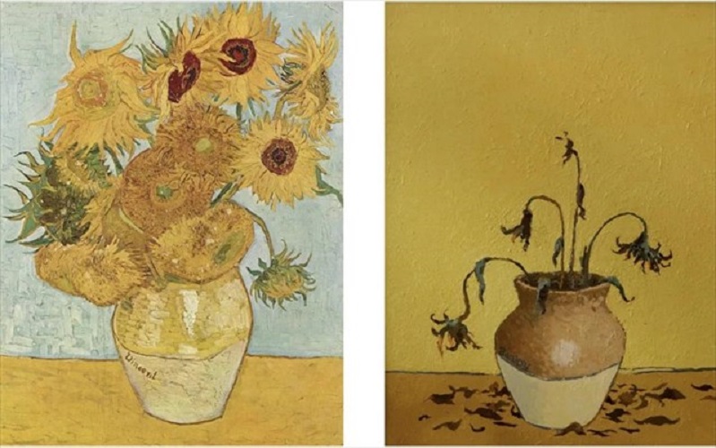 Το εμπνευσμένο από τους πίνακες του Βαν Γκογκ με θέμα τα ηλιοτρόπια, σύμφωνα με εκτιμήσεις του Οίκου δημοπρασιών Christie’s αναμένεται να πωληθεί 8,8 - 13,2 εκατ. αγγλικές λίρες (12-18 εκατ. δολάρια). Το έργο απεικονίζει ηλιοτρόπια σε βάζο, τα πέταλα των οποίων έχουν μαραθεί και πέσει.