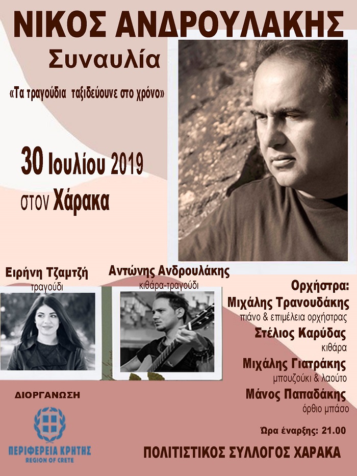 Δύο συναυλίες θα δώσει ο Νίκος Ανδρουλάκης, με την διοργάνωση της Περιφέρειας Κρήτης, την Τρίτη 30/7 στον Χάρακα και την Τετάρτη 31/7 στο Αβδού Πεδιάδος.